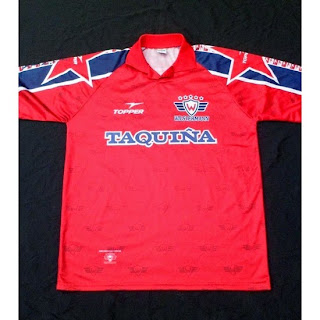 Diseño oficial del año 2015, predominante color rojo color sangre, a los costados y bajo los brazos con lineas azules, los shorts azules con pequeñas lineas rojas.